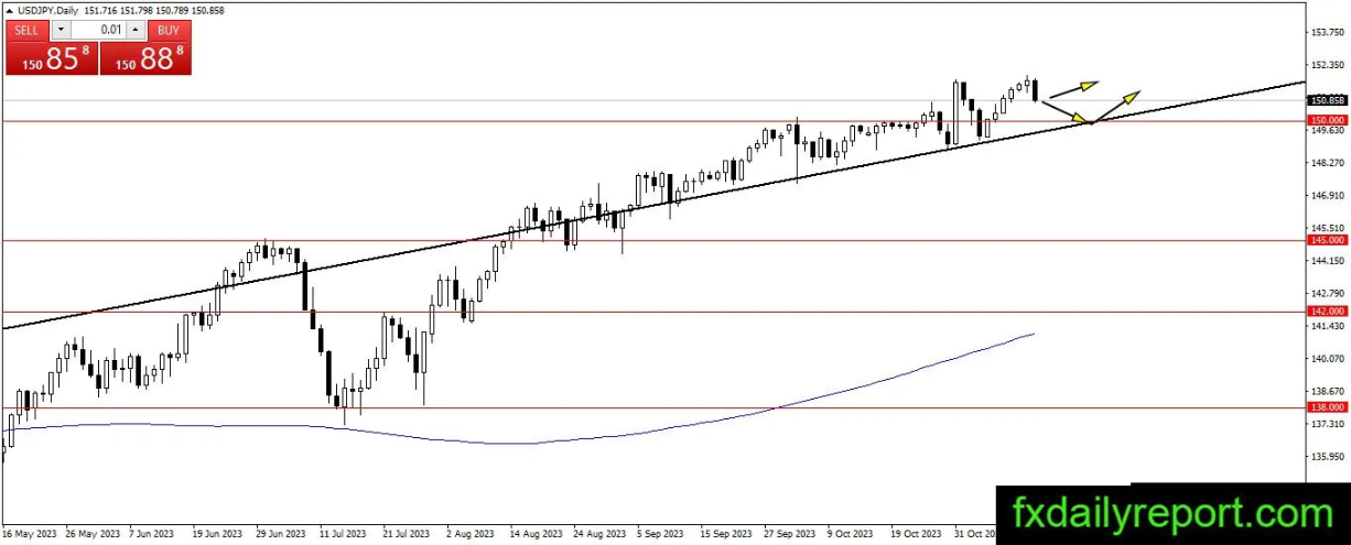 美元/日元今日交易看起来走弱,并有机会跌向150.00。交易者将等待价格跌破150.00并形成较低的波动低点,以确认看跌走势的延续。只要尚未形成较低的摆动低点,看涨走势仍有机会继续。