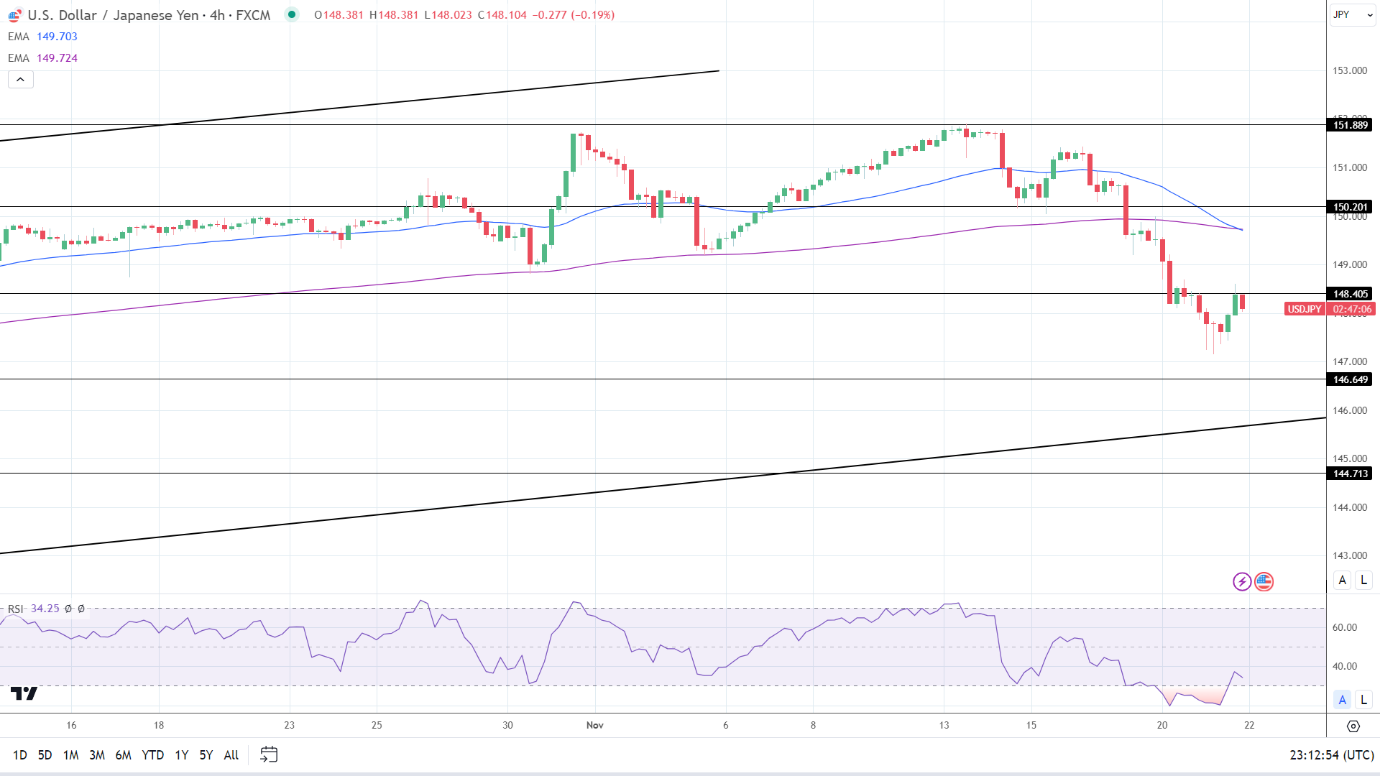 14周期4小时RSI为34.25,表明美元/日元在进入超卖区域之前会跌破148。