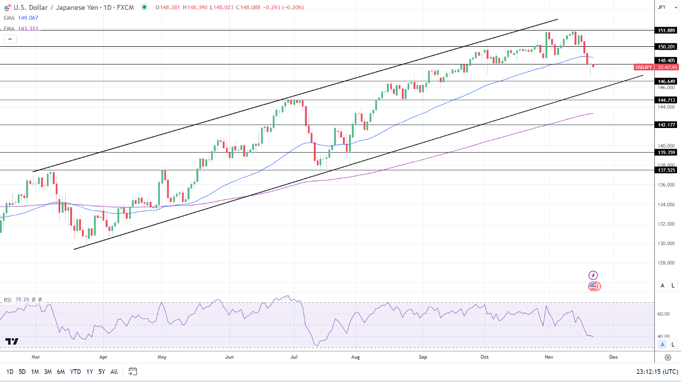 14天RSI为39.26,表明美元/日元在进入超卖区域之前将跌至148以下。
