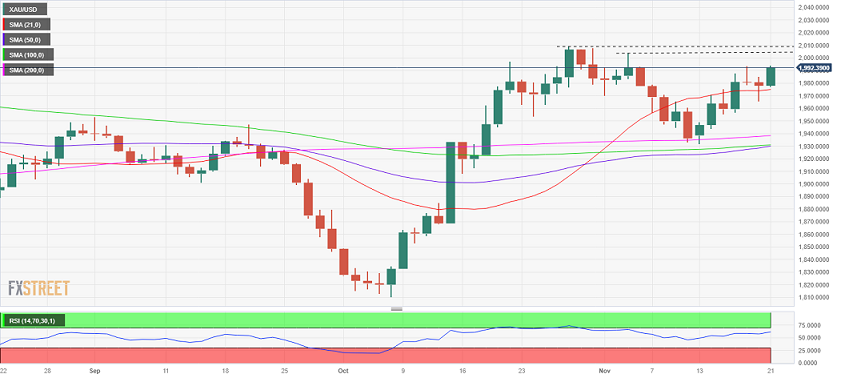 FXStreet分析师Dhwani Mehta指出,周一,黄金价格收于21日简单移动平均线(SMA)上方1975美元/盎司,盘中曾短暂跌破该均线。这一看涨信号似乎为黄金买家提供新的推动力,他们试图重新夺回2000美元/盎司关口。
