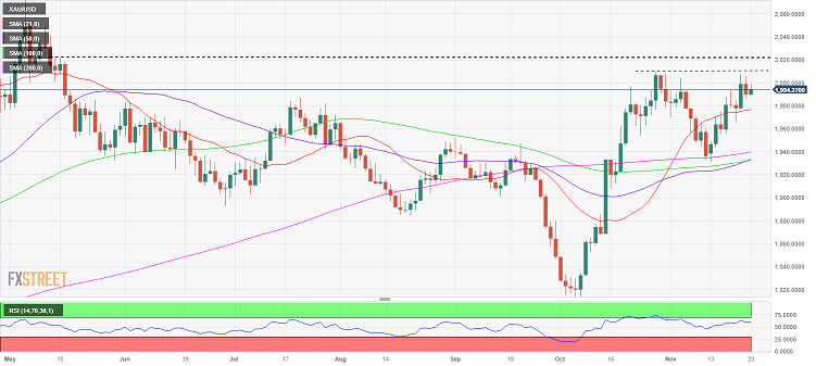 周四(11月23日)欧市盘中,现货黄金维持日内升势,金价目前位于1995美元/盎司附近。FXStreet分析师Dhwani Mehta指出,在美元再次走软的背景下,黄金价格正向2000美元/盎司发起新一轮升势。Mehta警告称,感恩节假期可能会夸大金价走势。
