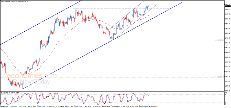 金价在之前几个交易日触及2009.30美元/盎司后,呈现新的上升走势,这支持金价在未来几个交易日继续看涨趋势。如图所示,金价在看涨通道内交易,下一目标位于2030.00美元/盎司。