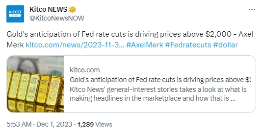 尽管金价未能将涨幅维持在每盎司2050美元以上,但11月底金价仍创下有记录以来的最高月度价格。