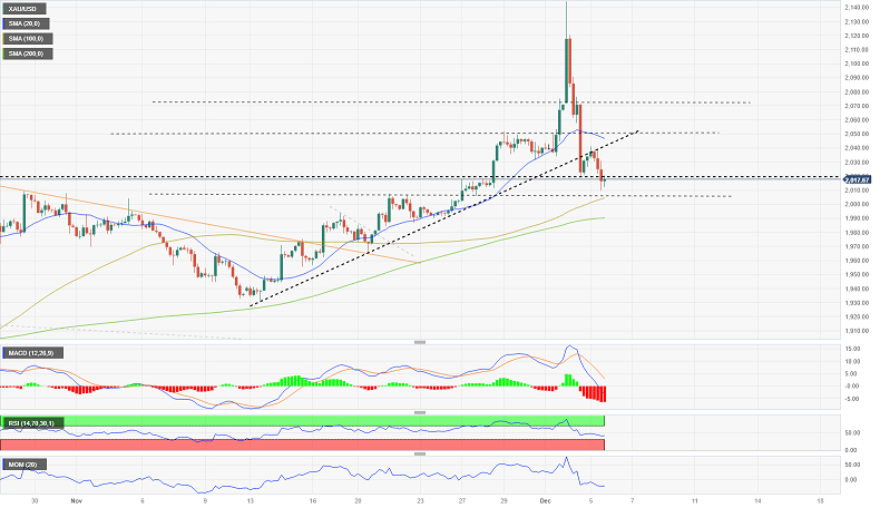 周三(12月6日)亚市尾盘,现货黄金维持日内温和反弹走势,金价现报2023美元/盎司附近。FXStreet分析师Matías Salord最新撰文,对黄金技术前景进行分析。
