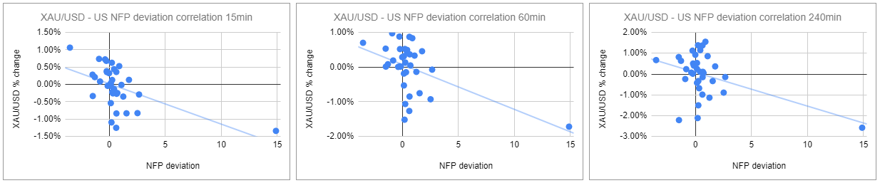 我们绘制了非农数据发布后的15分钟、1小时和4小时内的黄金价格反应。然后,我们将黄金价格的反应与实际非农结果与预期结果之间的偏差进行比较。