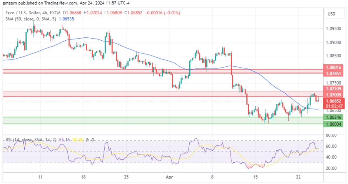 欧元/美元未能突破阻力位1.0700 – 1.0720,并试图跌破1.0680。如果欧元/美元跌破1.0680,它将走向50移动平均线1.0653。