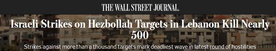 美国《华尔街日报》报道称,黎巴嫩当局说,以色列对黎巴嫩真主党的袭击造成近500人死亡,其中包括数十名妇女和儿童,另有1600多人受伤。这是自去年10月目前的敌对行动开始以来最致命的袭击浪潮。